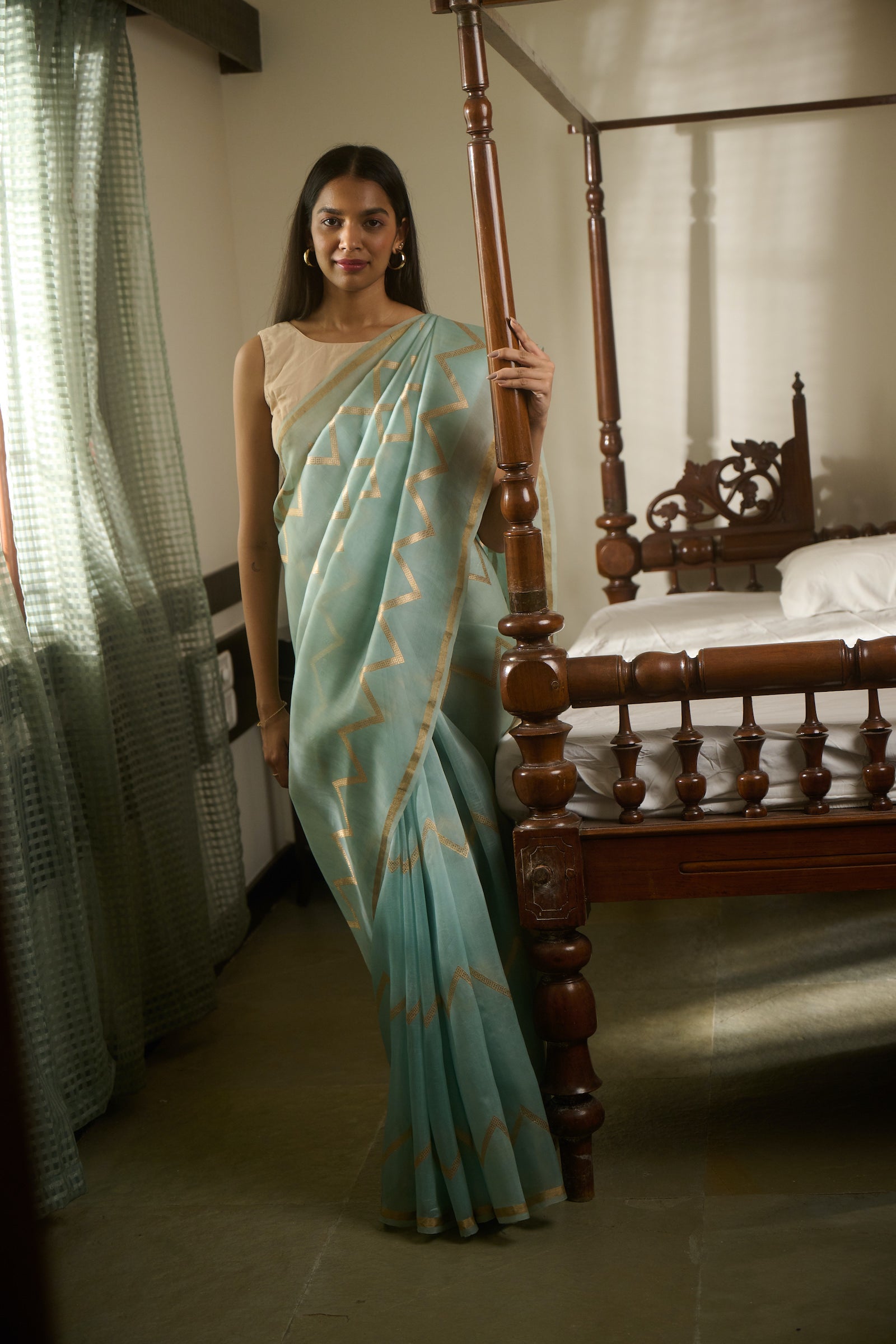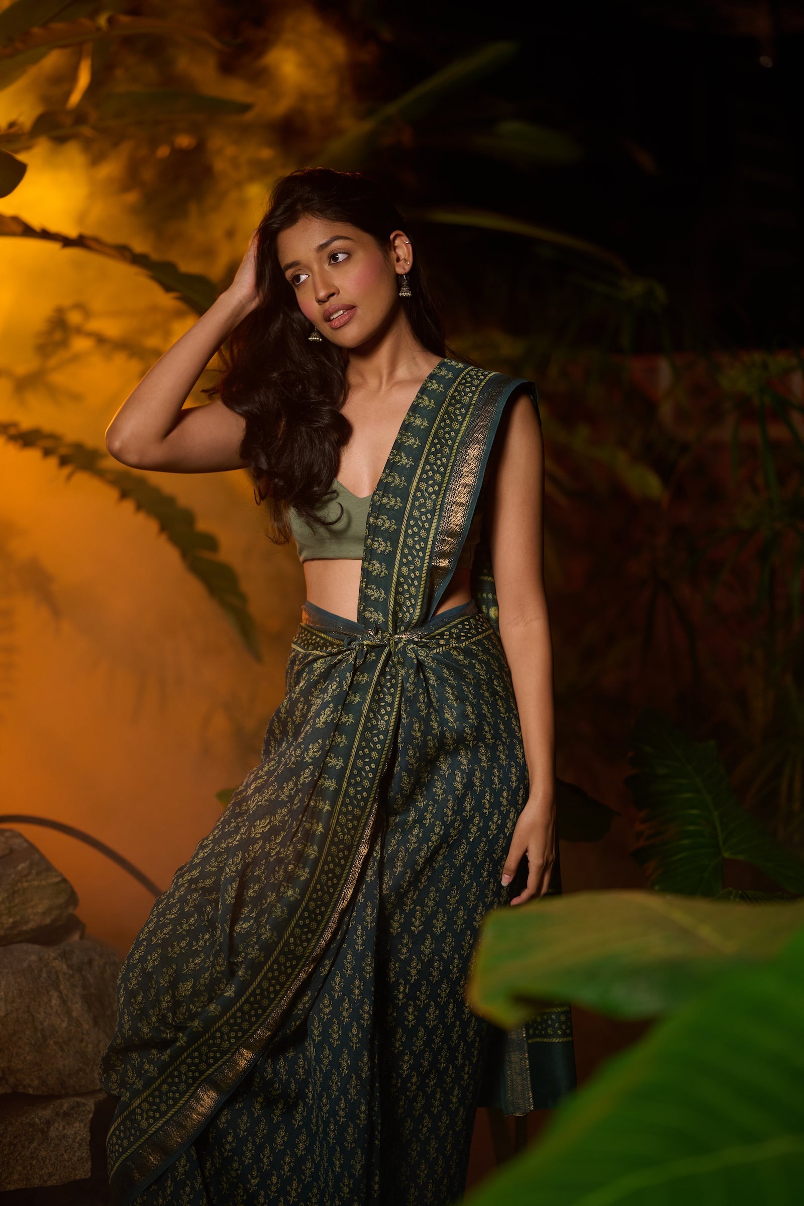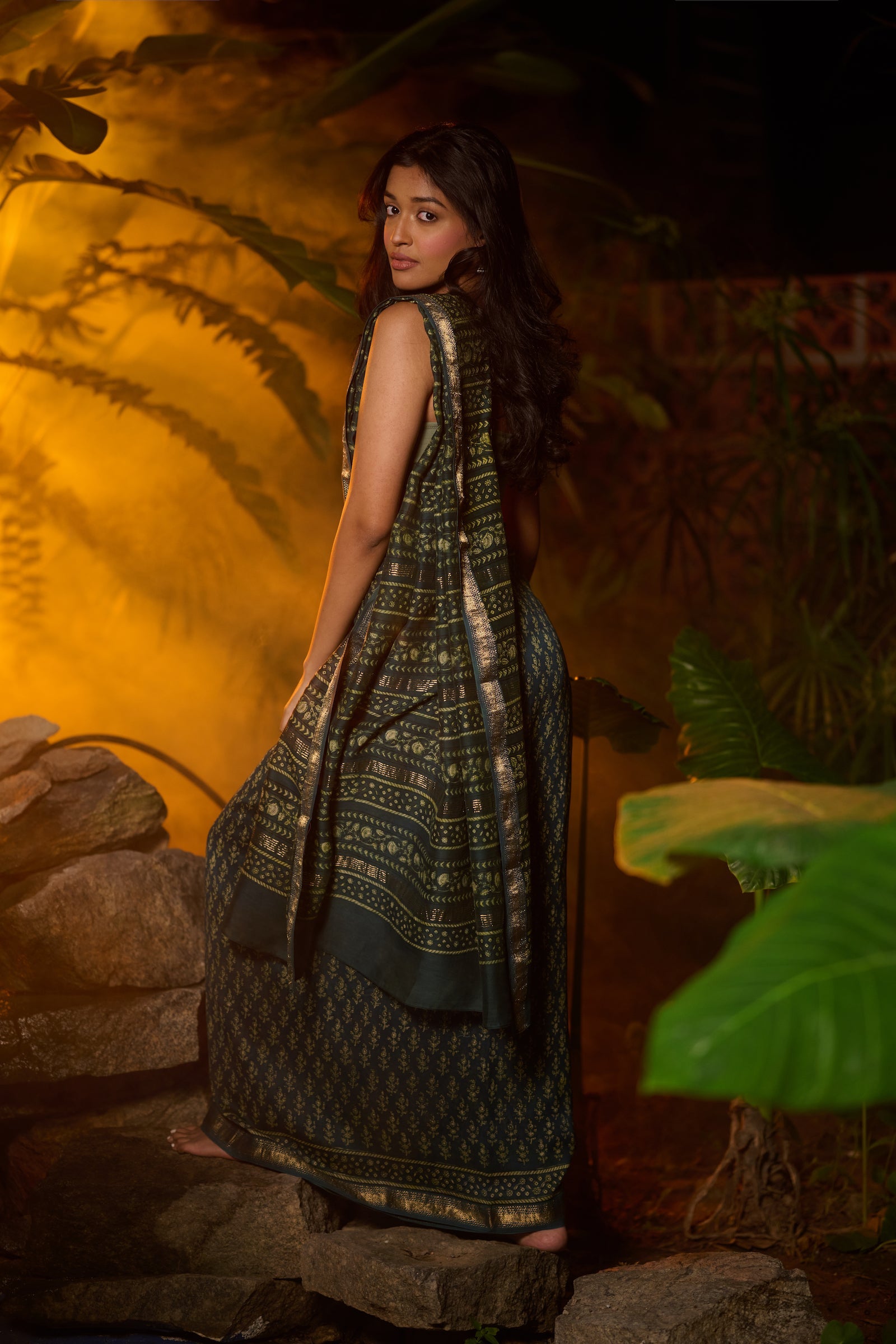 Bagru print green Maheshwari saree