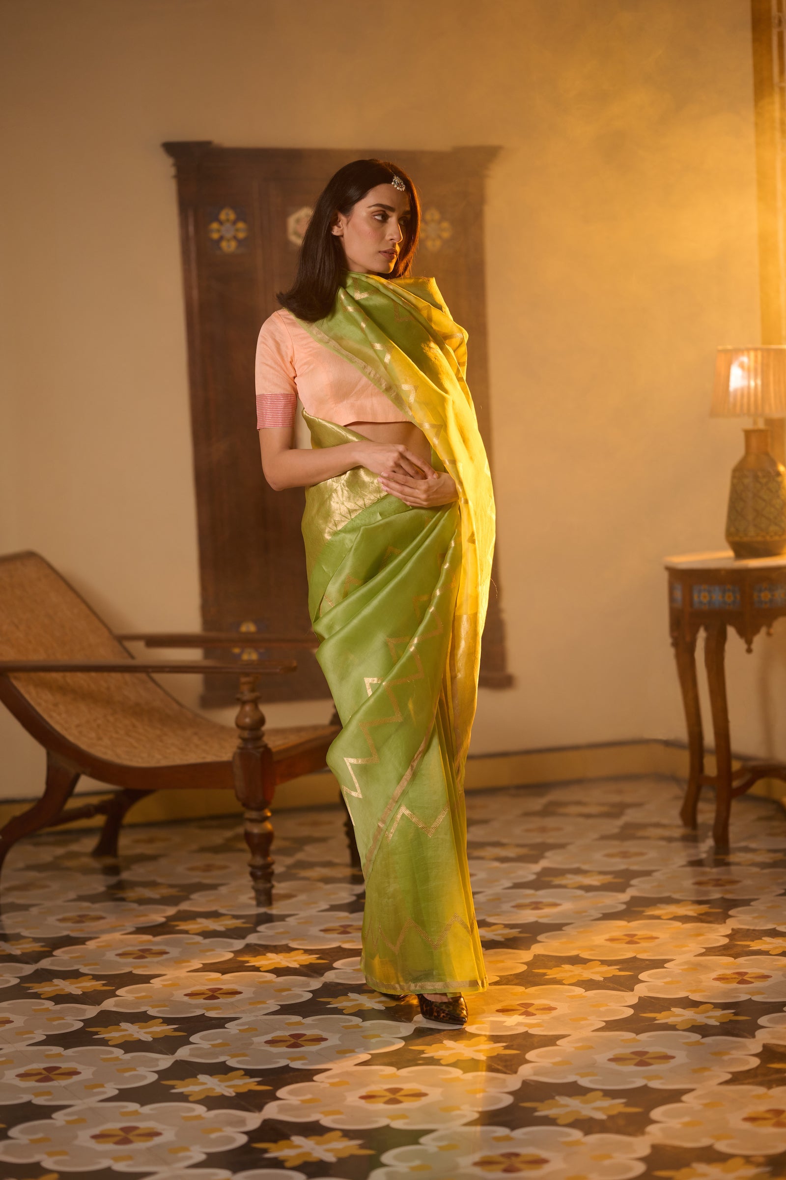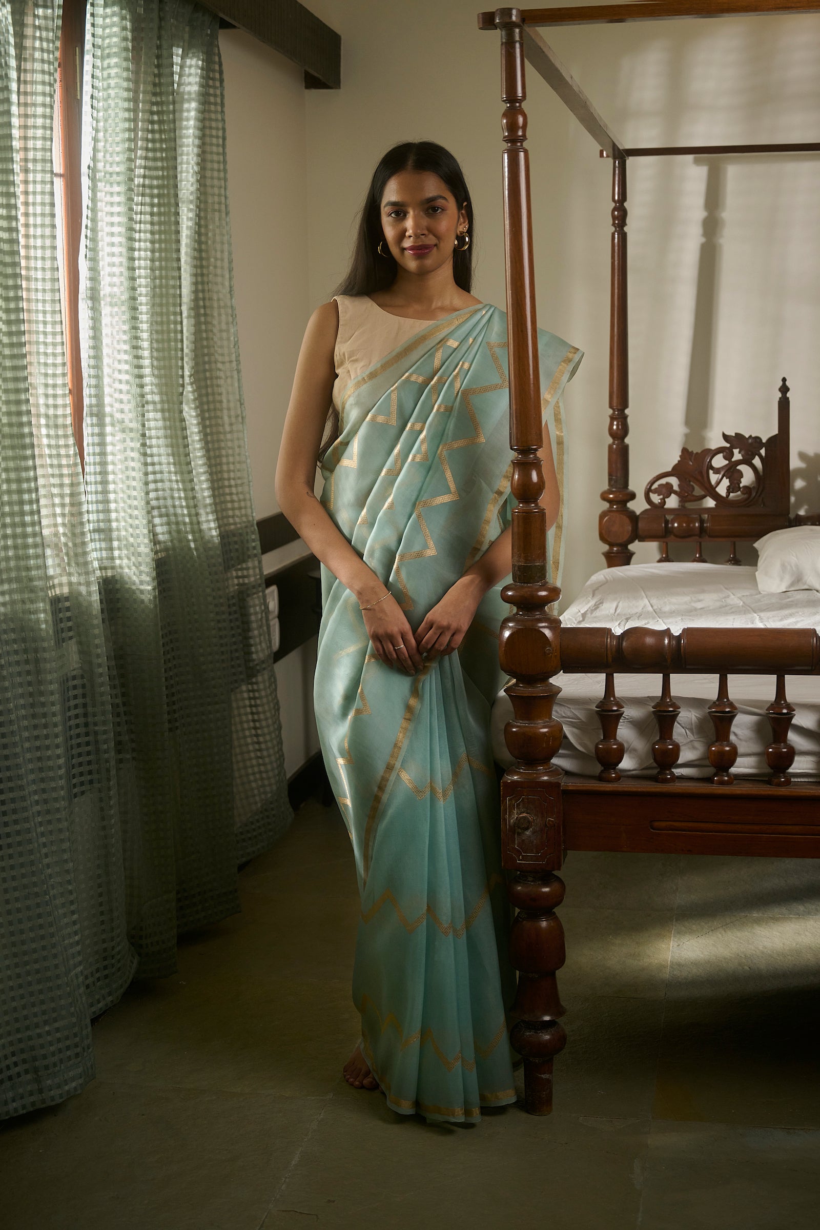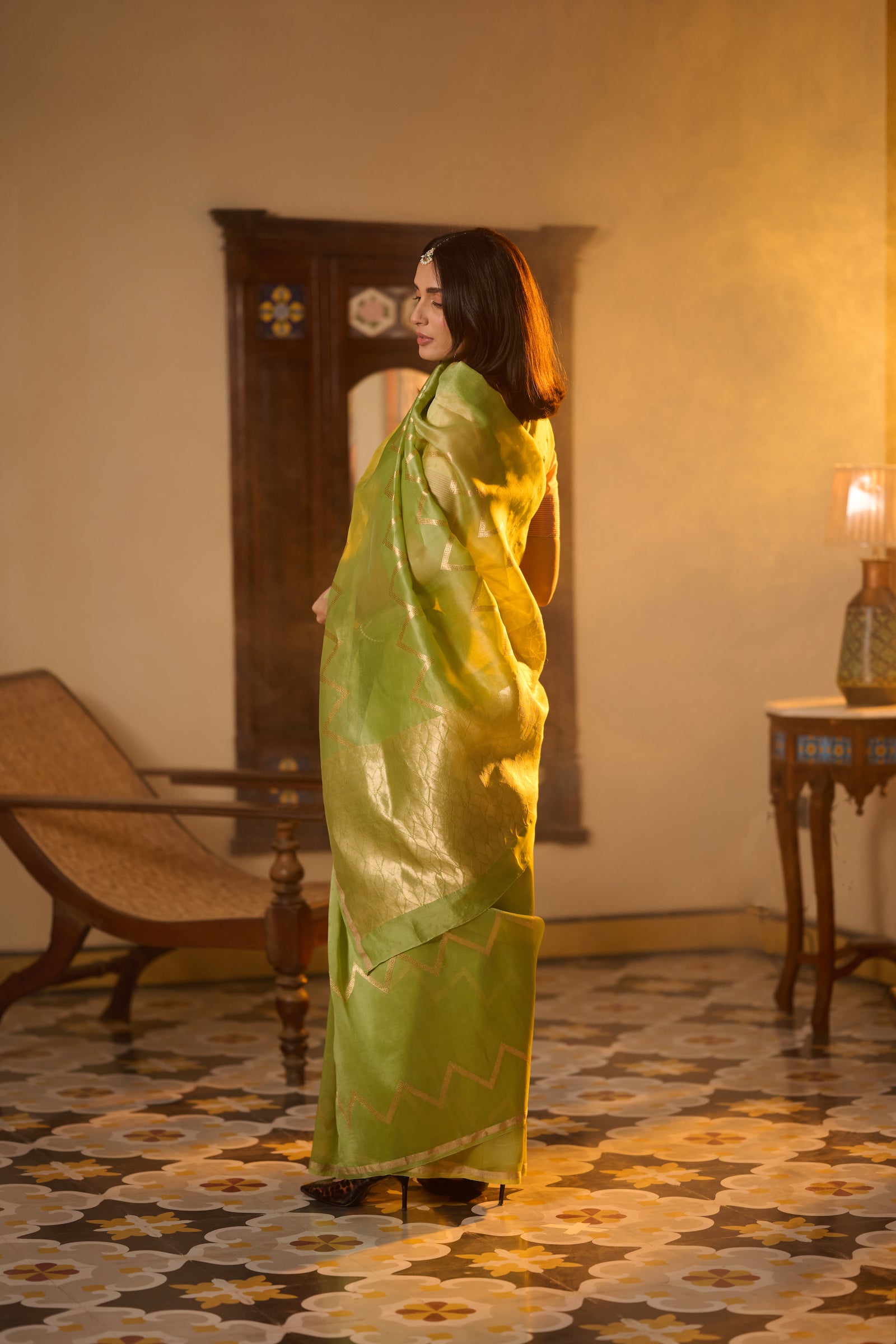 Bagru print green Maheshwari saree