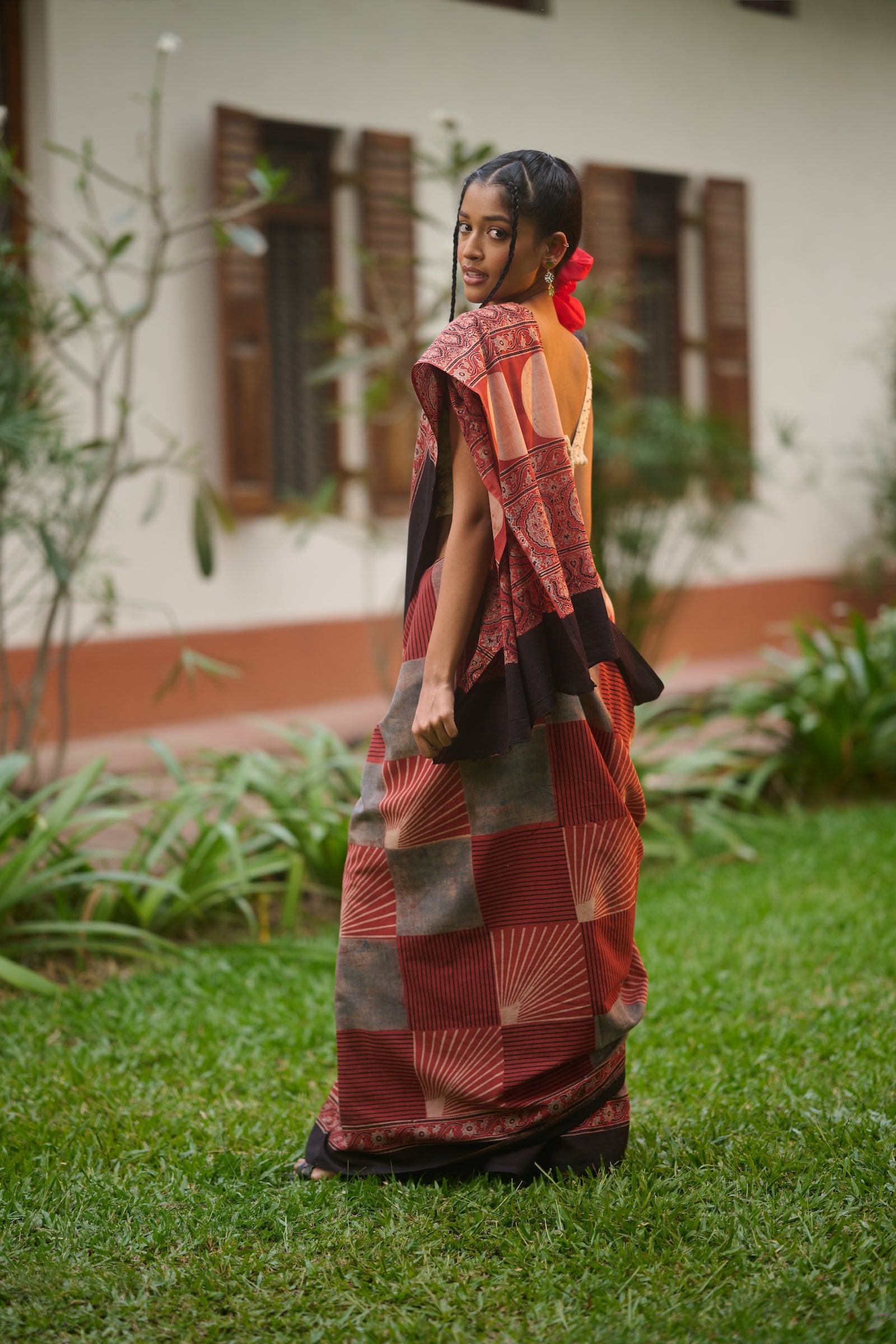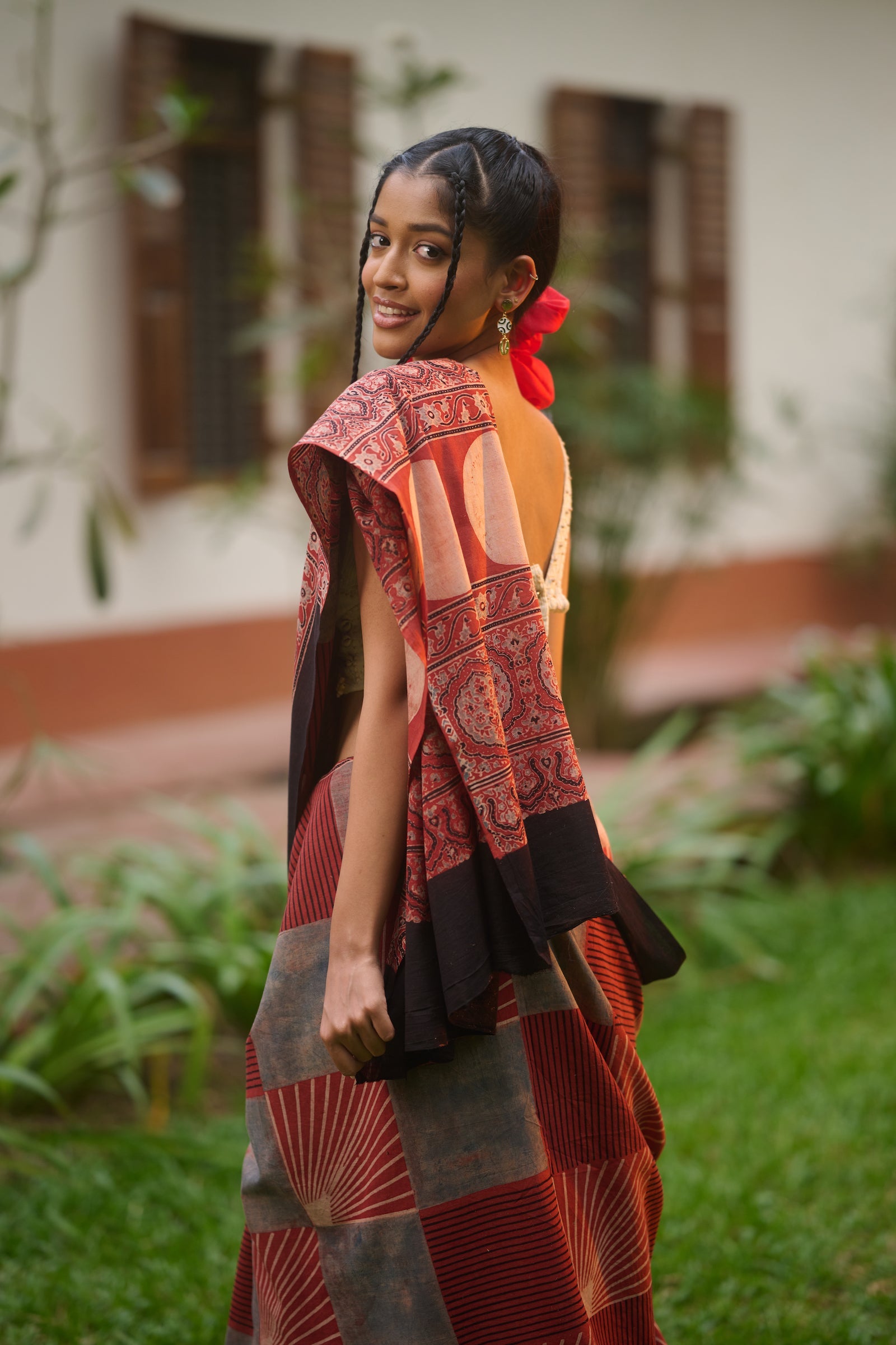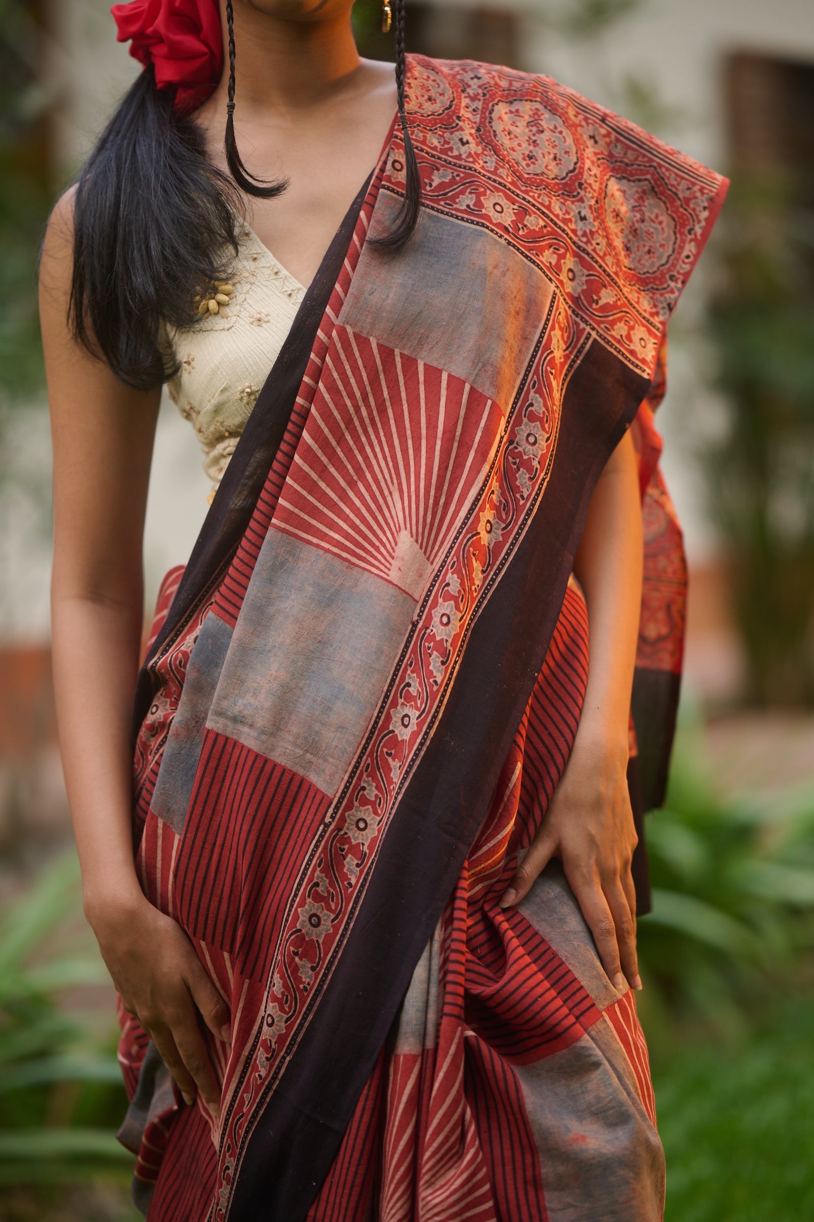 Ajrakh red mul cotton saree