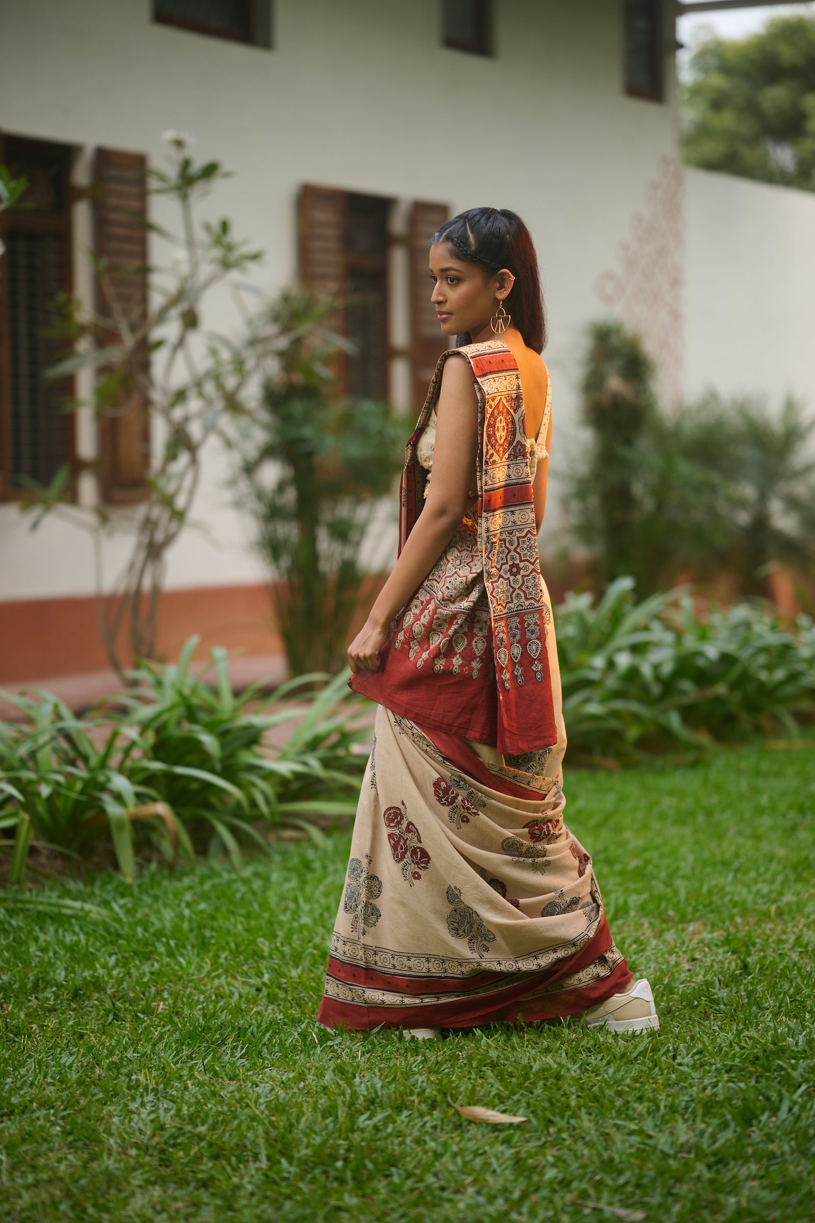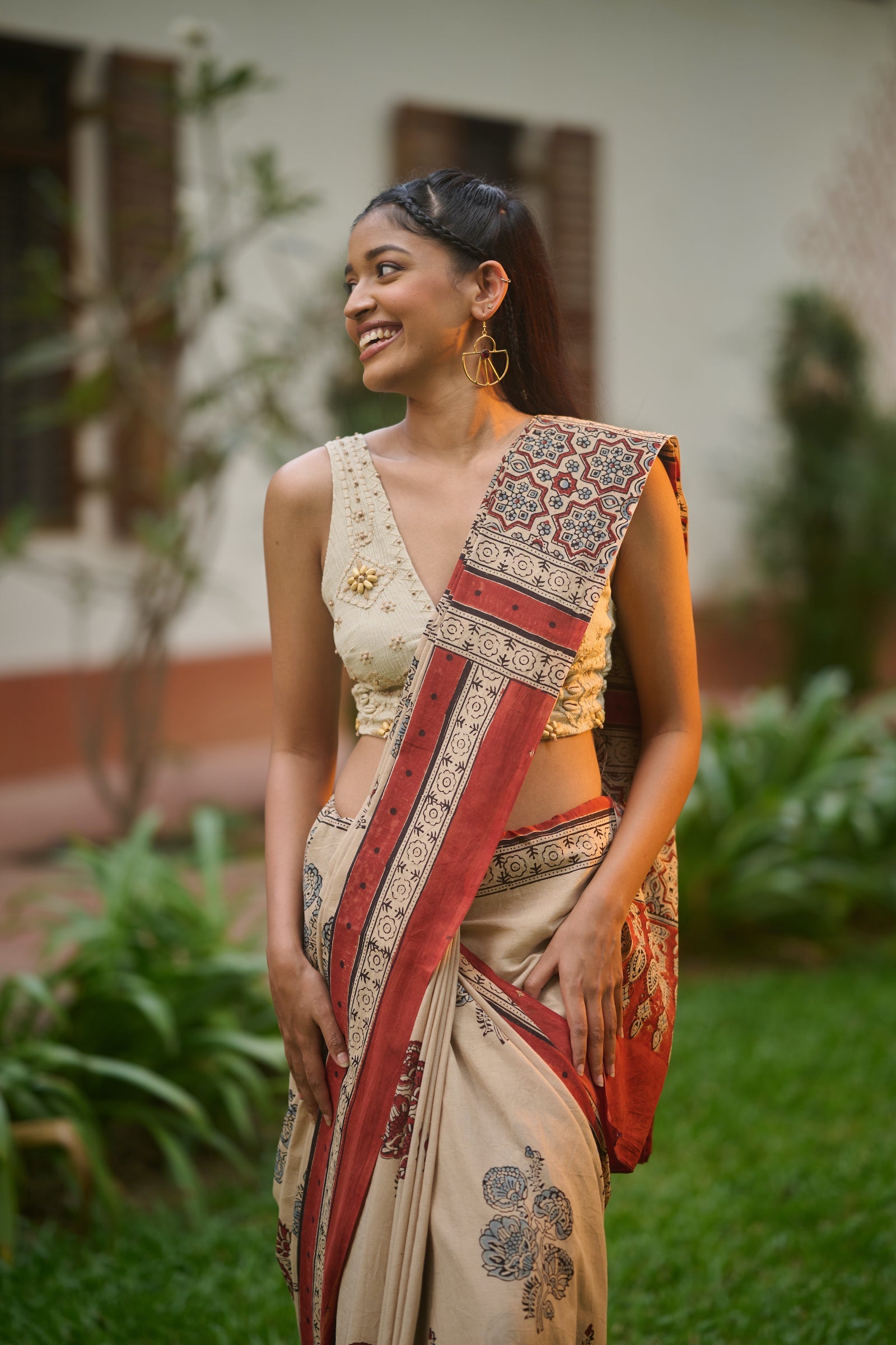 Ajrakh cream mul cotton saree