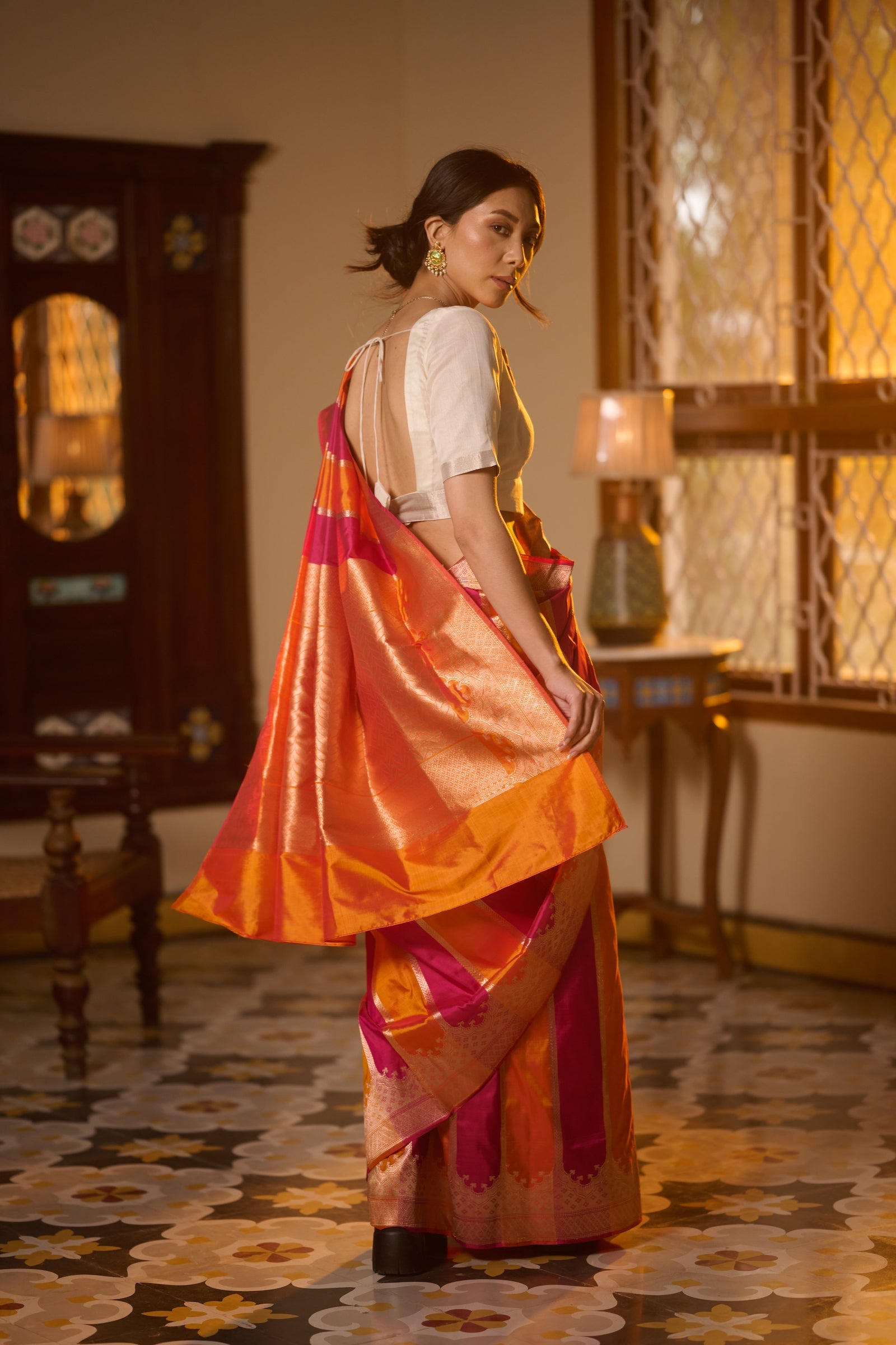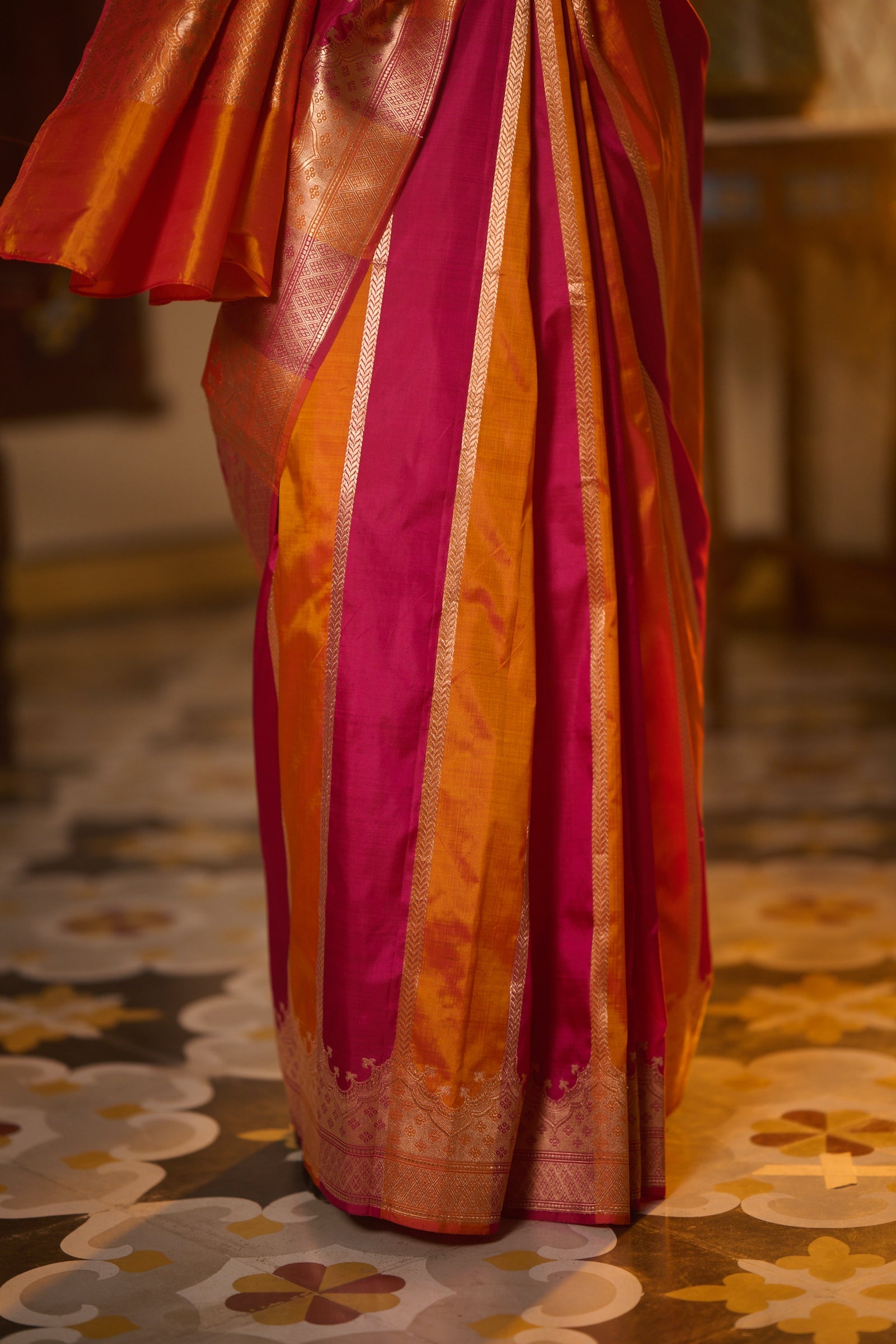 Banarasi kattan silk pink orange saree
