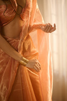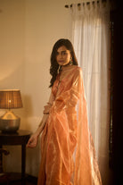 Indulge in the artistry of handwoven elegance with our Banarasi Tissue Silk Peach Handwoven Saree, a masterpiece of intricate craftsmanship. Meticulously crafted from premium Banarasi silk, this saree offers both luxurious comfort and exquisite style. The delicate peach hue adds a touch of femininity and charm to the ensemble, while the handwoven details elevate its elegance. Whether you're attending a formal event or a casual gathering, this saree effortlessly enhances your style with its understated allure. Embrace the timeless beauty of handwoven Banarasi silk and make a statement with our Banarasi Tissue Silk Peach Handwoven Saree.