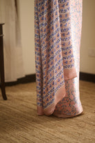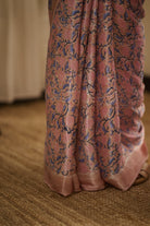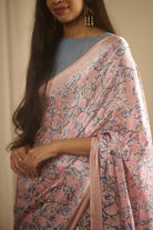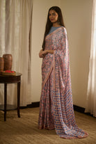 A charming Handblock Bagru saree adorned with delicate pink floral motifs on smooth modal fabric, blending elegance with a touch of tradition. Perfect for any graceful occasion.