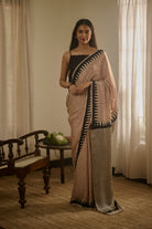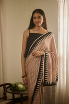 A striking Handblock Bagru saree with bold geometric patterns on soft modal fabric, combining modern design with traditional craftsmanship. Perfect for a unique, sophisticated style.