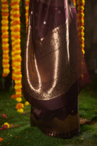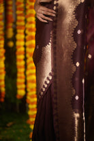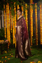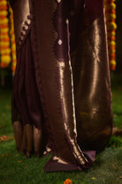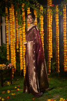 Exquisitely handwoven Banarasi silk saree in brown, embellished with lustrous organza, kadwa buta.