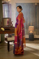 Handwoven, elegant and lustrous Maheshwari multi shade saree, adorned with gold border.