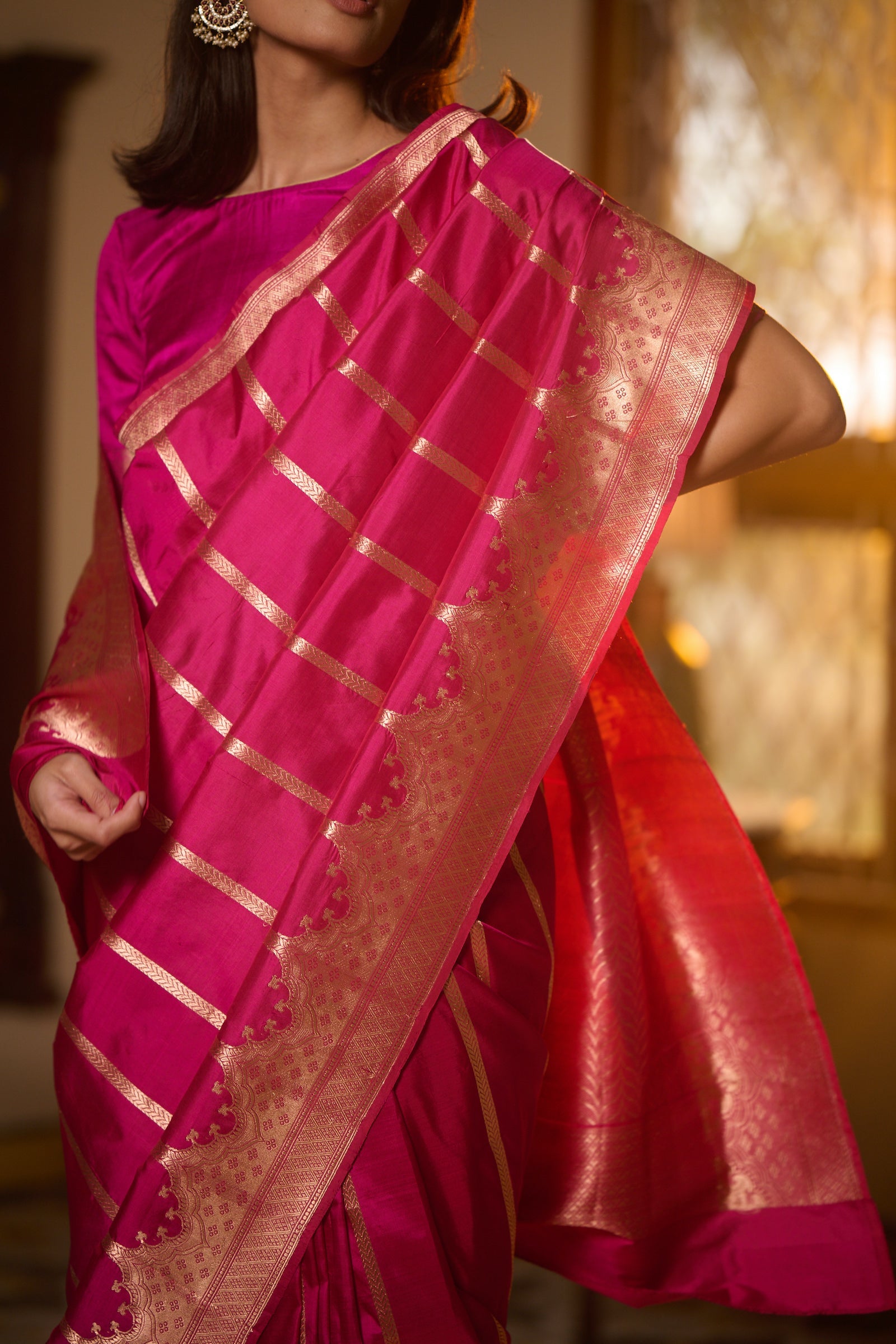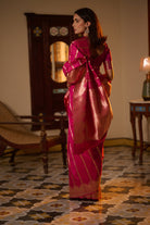 Indulge in timeless elegance with our Banarasi Katan Silk Pink Handwoven Saree, a true symbol of grace and sophistication. Meticulously handwoven from premium Banarasi silk, this saree offers both luxurious comfort and exquisite style. The delicate pink hue adds a touch of femininity and charm to the ensemble, making it perfect for various occasions. Whether you're attending a formal event or a casual gathering, this saree effortlessly enhances your style with its understated allure. Embrace the timeless beauty of handwoven Banarasi silk and make a statement with our Banarasi Katan Silk Pink Handwoven Saree.