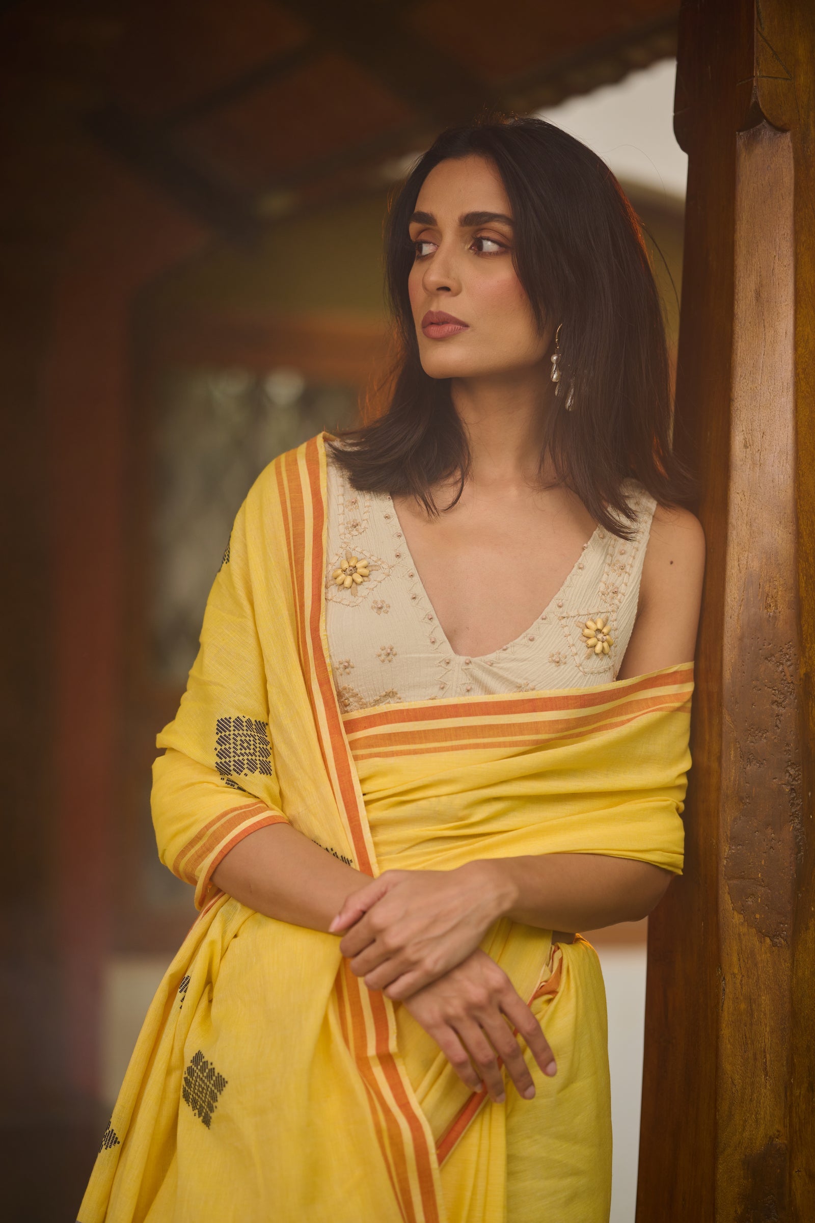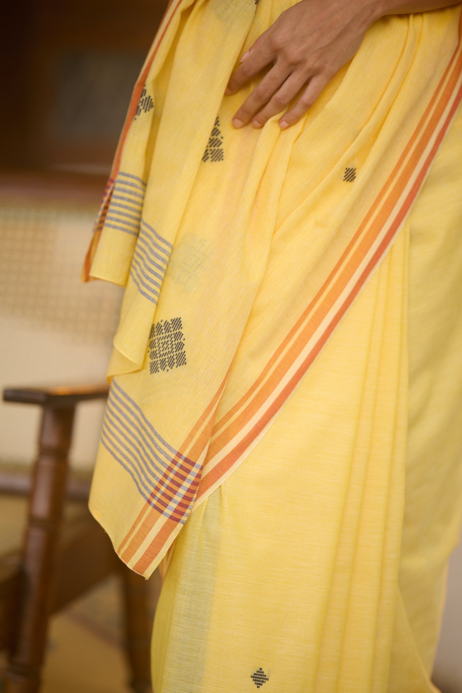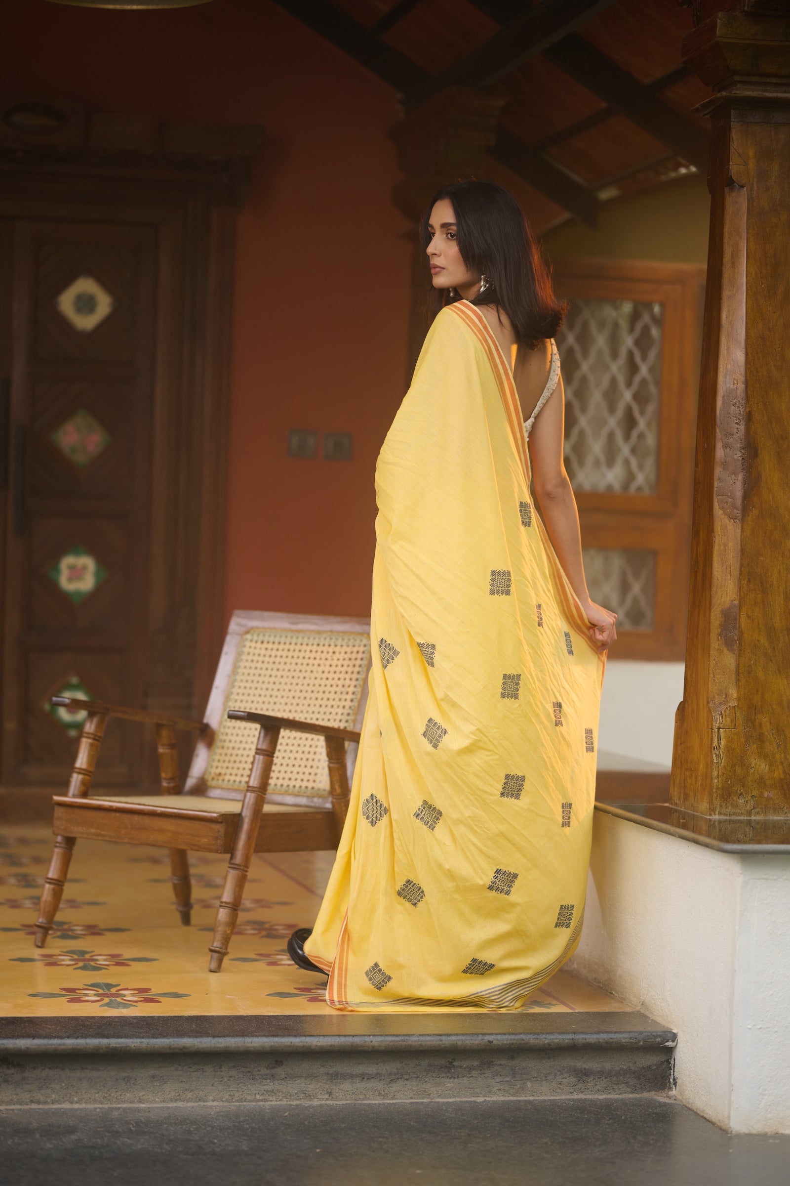 Add a touch of radiant elegance to your wardrobe with our Yellow Cotton Baawan Buti Saree. Crafted from premium cotton, this saree offers both comfort and style. The traditional Baawan Buti motifs, intricately woven into the fabric, add a timeless charm to the ensemble. The vibrant yellow hue exudes warmth and vibrancy, making it a perfect choice for various occasions. Whether it's a festive celebration or a casual gathering, this saree effortlessly enhances your style with its understated elegance. Embrace the traditional beauty of Baawan Buti motifs and make a statement with our Yellow Cotton Baawan Buti Saree.